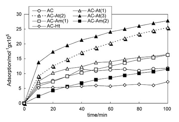 實(shí)驗(yàn)條件:在N2中使用210ppm的甲硫醇作為甲硫醇?xì)怏w。活性炭的制備,活性炭通過碳化隨后活化制備。用蒸汽進(jìn)行活化。用HNO3/H2SO4溶液進(jìn)行活性炭的酸處理。將1克活性炭在100立方厘米HNO3/H2SO4溶液中在室溫下攪拌0.5小時(shí)。過濾分離經(jīng)過處理的活性炭,并在超聲條件下用去離子水洗滌數(shù)次,直到水的pH值達(dá)到5以上。然后將活性炭在100℃空氣中干燥12小時(shí),在150℃下真空干燥1小時(shí)。用HNO3,HNO3/H2SO4(1/1比例)和HNO3/H2SO4(1/3比率)處理的活性炭分別表示為AC-At(1.2.3)。胺化合物對(duì)活性炭的改性通過十六胺的吸附來進(jìn)行。將活性炭浸入十六烷胺/乙醇溶液中并在室溫下攪拌30分鐘。然后過濾分離活性炭并在室溫下真空干燥2小時(shí)。由4×10-6和3.3×10-5摩爾m-3十六胺溶液制備的活性炭分別表示為AC-Am(1.2);钚蕴(AC-Ht)的熱處理在Ar氣氛中在600℃下進(jìn)行2小時(shí)。